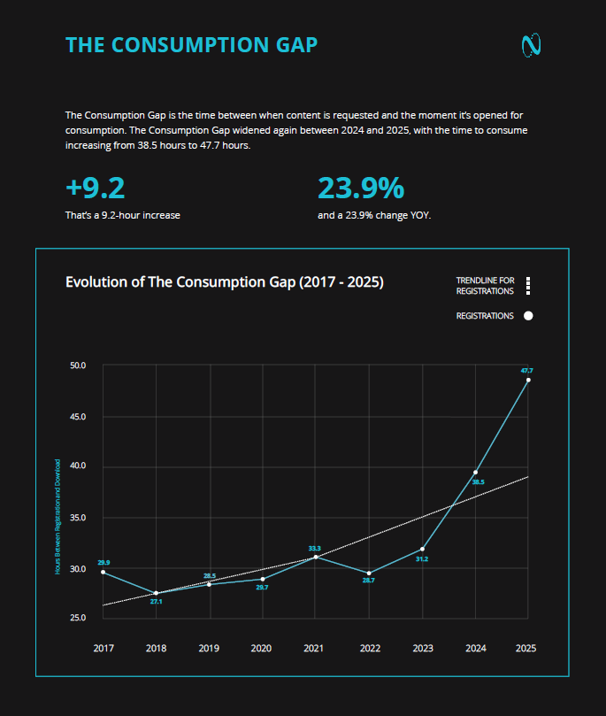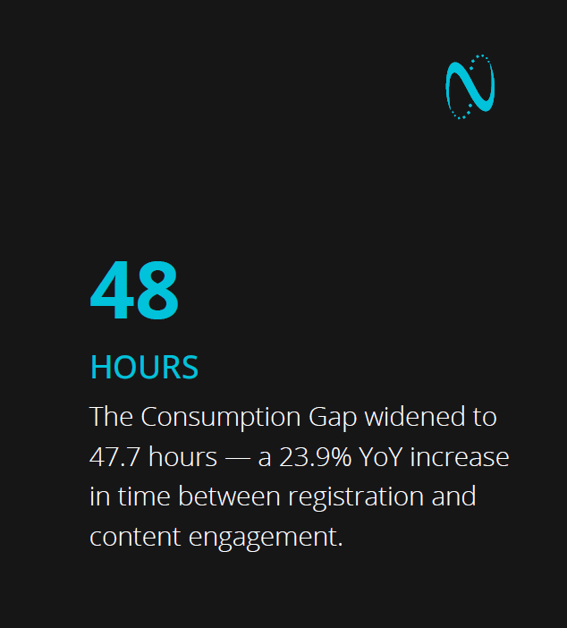 In 2025, the average B2B professional waited 47.7 hours between requesting a piece of content and actually opening it—a 9.2-hour increase year over year, and a 23.9% jump from 2024. We call this period between request and open (download) the Consumption Gap.