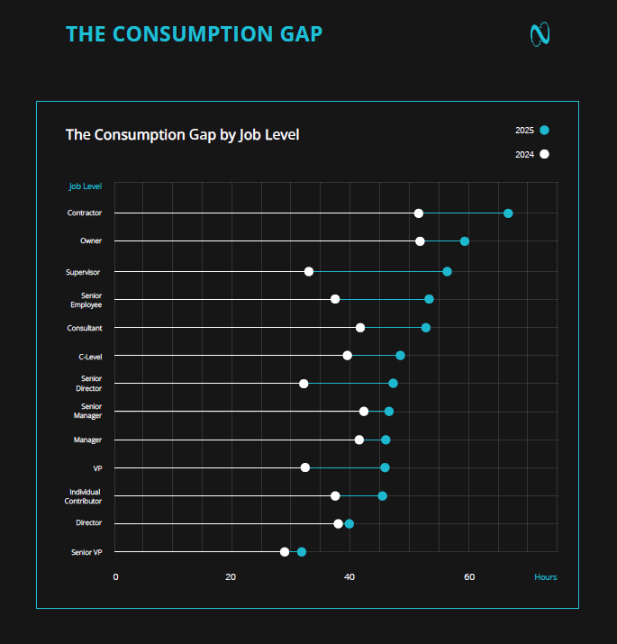 In 2025, C-level professionals had a Consumption Gap of 48.3 hours. It’s not much, but that is greater than the global average.
