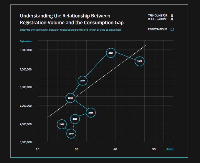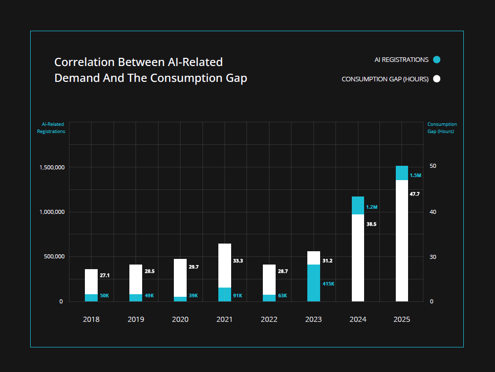 In 2025, AI-related content accounted for 21.1% of all demand on NetLine—1.5 million registrations, a 28.5% increase over the prior year. At the same time, the Consumption Gap hit its all-time high of 47.7 hours.