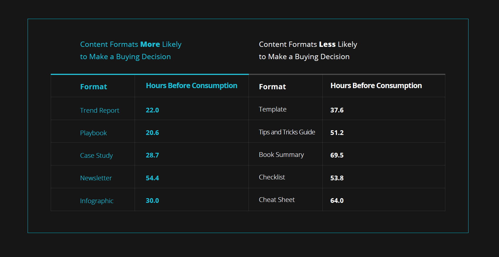 The formats most strongly correlated with near-term purchase intent—Playbooks and Trend Reports especially—are the ones being consumed quickest. When someone registers for a Playbook and opens it within 20 hours, that’s not a passive registration. That’s urgency. That’s a buyer who wanted the answer fast because they have a problem to solve now.